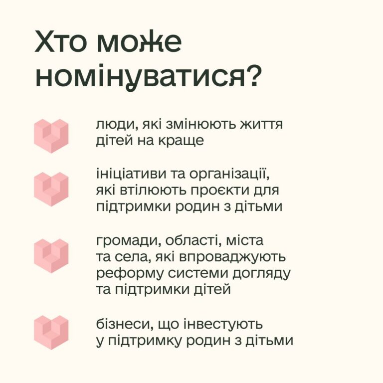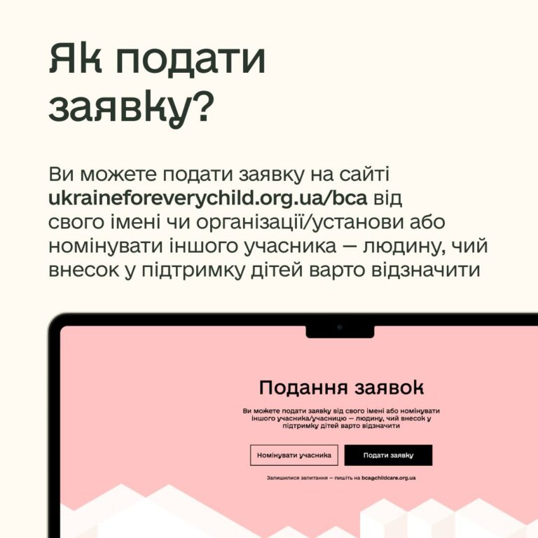 Номінуйте себе, людей, громади, області, бізнеси чи ініціативи, чий внесок варто відзначити. Більше деталей — на сайті: https://ukraineforeverychild.org.ua/bca.
