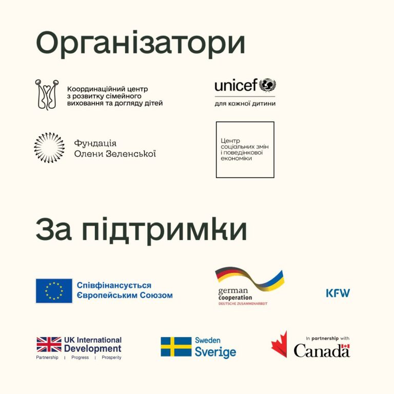 Довідково. Це спільна ініціатива Координаційного центру з розвитку сімейного виховання та догляду дітей у партнерстві з UNICEF Ukraine, Фундацією Олени Зеленської, Центром соціальних змін і поведінкової економіки за підтримки European Union in Ukraine, British Embassy Kyiv, Embassy of Sweden in Kyiv, Bundesministerium für wirtschaftliche Zusammenarbeit und Entwicklung (BMZ), Посольства Німеччини в Києві та Embassy of Canada to Ukraine.